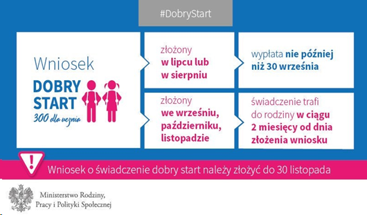 Jednocześnie przypominamy, że do 30.11.2019 r. można złożyć wniosek o ustalenie prawa do świadczenia ,,Dobry start”.
