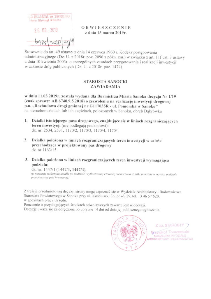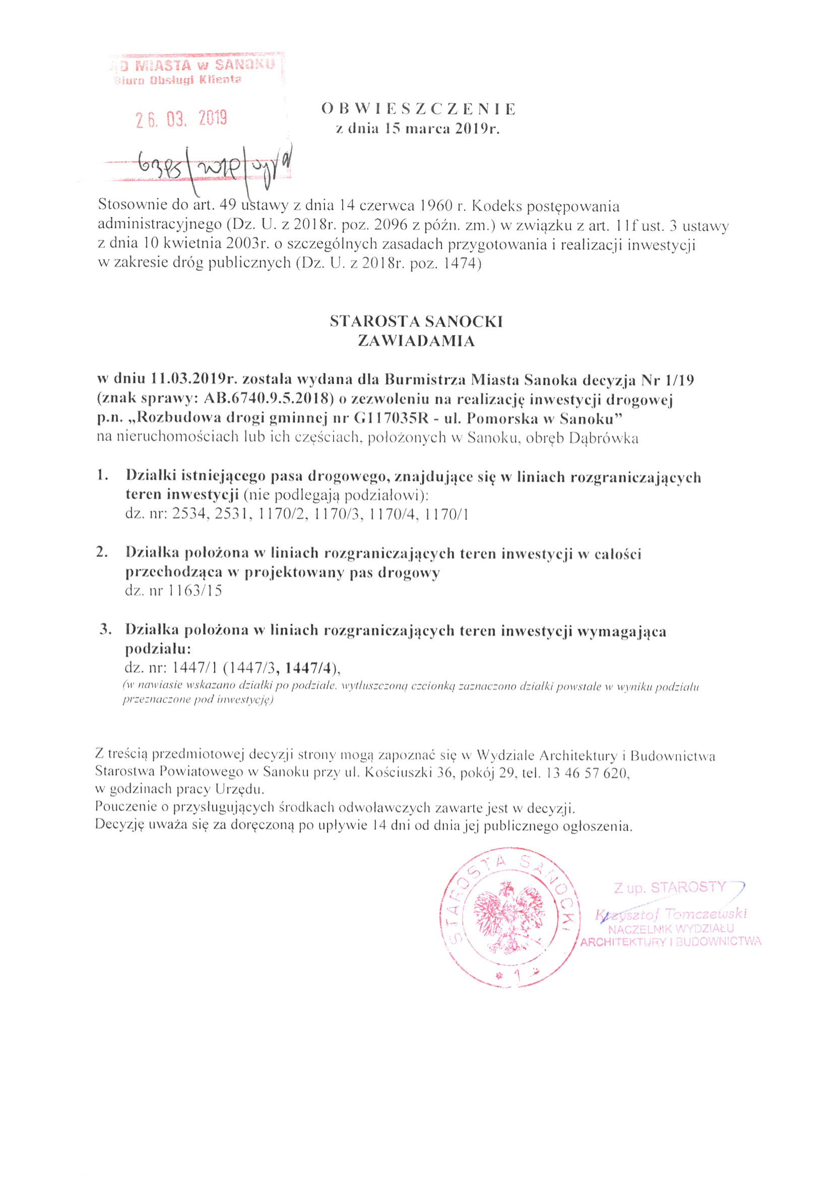 Dodano: 27-03-2019Starosta Sanocki zawiadamia, że w dniu 11.03.2019 r. została wydana dla Burmistrza Miasta Sanoka decyzja nr 1/19 (znak sprawy: AB.6740.9.5.2018) o zezwoleniu na realizację inwestycji drogowej pn. „Rozbudowa drogi gminnej nr G117035R – ul. Pomorska w Sanoku” na nieruchomościach lub ich częściach, położonych w Sanoku, obręb Dąbrówka. Poniżej treść obwieszczenia: