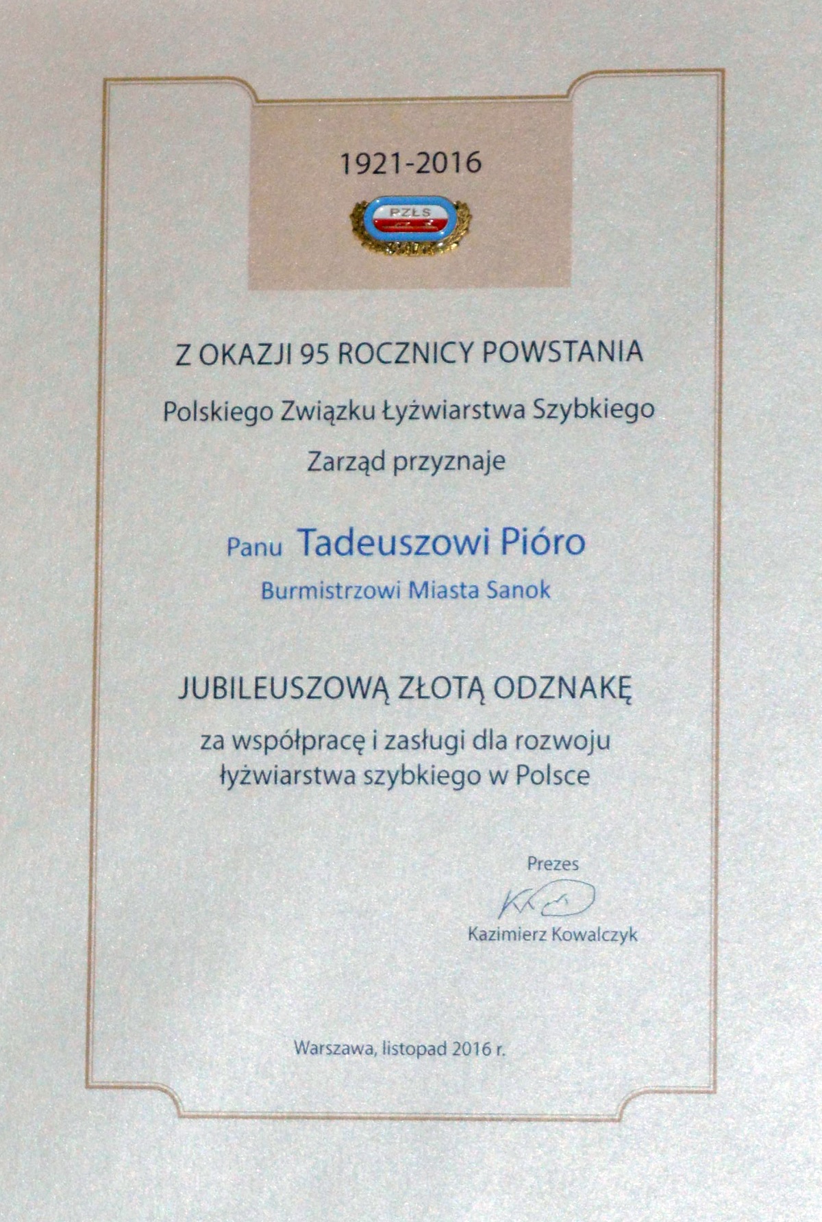 Z kolei gospodarz miasta na ręce ustępującego z roli prezesa PZŁS Kazimierza Kowalczyka złożył serdeczne podziękowania za lata pracy na rzecz rozwoju dyscypliny, której szefował w latach 1986-2002 oraz 2006-2016. Uwiecznione zostały one na okolicznościowym grawertonie. Dziękując, Tadeusz Pióro skierował m. in. te słowa: „Od lat jest Pan nierozerwalnie związany z łyżwiarstwem szybkim, wrósł Pan w jego historię, znalazł także trwałe miejsce w sercach kibiców. Z dumą i radością obserwowaliśmy kolejne osiągnięcia, starania, aby zawodnicy mieli godne warunki do pracy i treningu, a kibice mogli być świadkami emocjonujących wydarzeń sportowych.”.