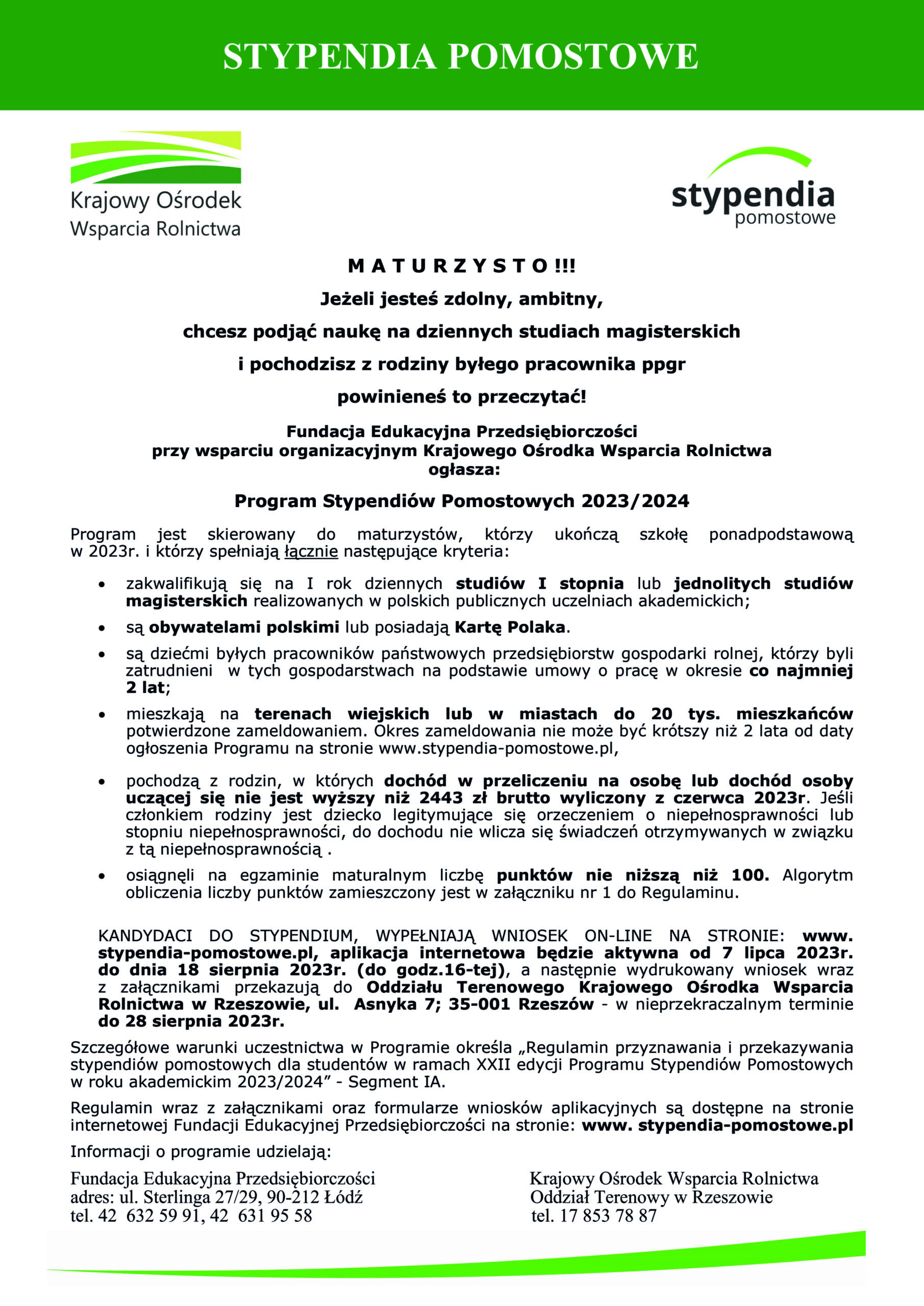 Stypendia pomostowe. Dodano: 06-07-2023 Maturzyści z małych miejscowości i niezamożnych rodzin mogą ubiegać się o dofinansowanie na I rok studiów dziennych w ramach rozbudowanego, ogólnopolskiego programu stypendialnego.