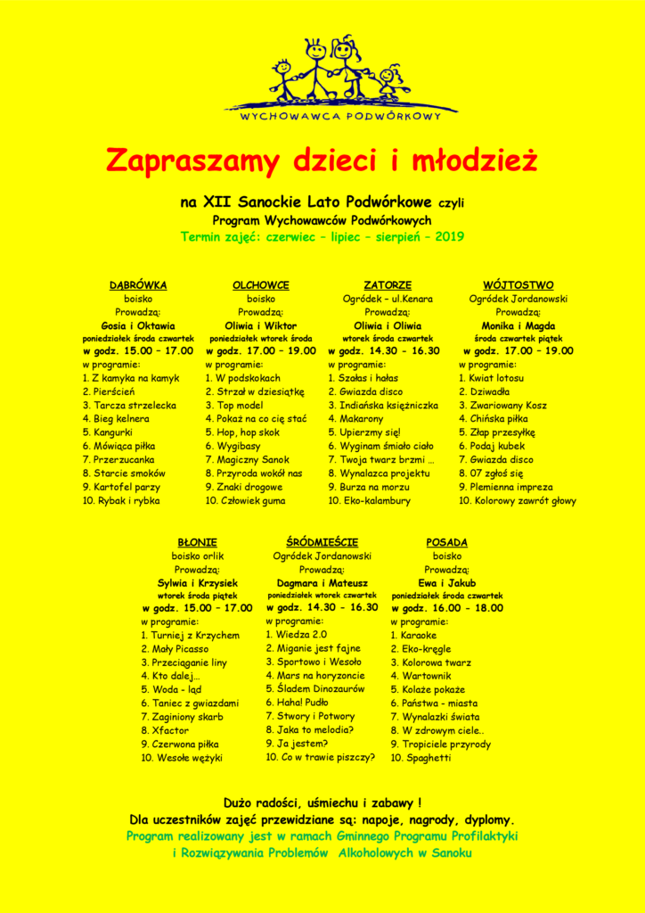 W tym roku zajęcia ruszają od 24 czerwca i potrwają 9 tygodni. Młodzi wychowawcy mają dla dzieci moc atrakcji – przygotowywali się do pracy już od maja. Będzie działało 7 podwórek, w każdej dzielnicy po jednym. Szczegółowy program w załączeniu. Zapraszamy wszystkie zainteresowane dzieci w wieku szkolnym – nudy nie będzie nie siedźcie w domu – zapraszamy Was na nasze podwórka! Program ten realizowany jest w ramach Gminnego Programu Profilaktyki i Rozwiązywania Problemów Alkoholowych w Sanoku.