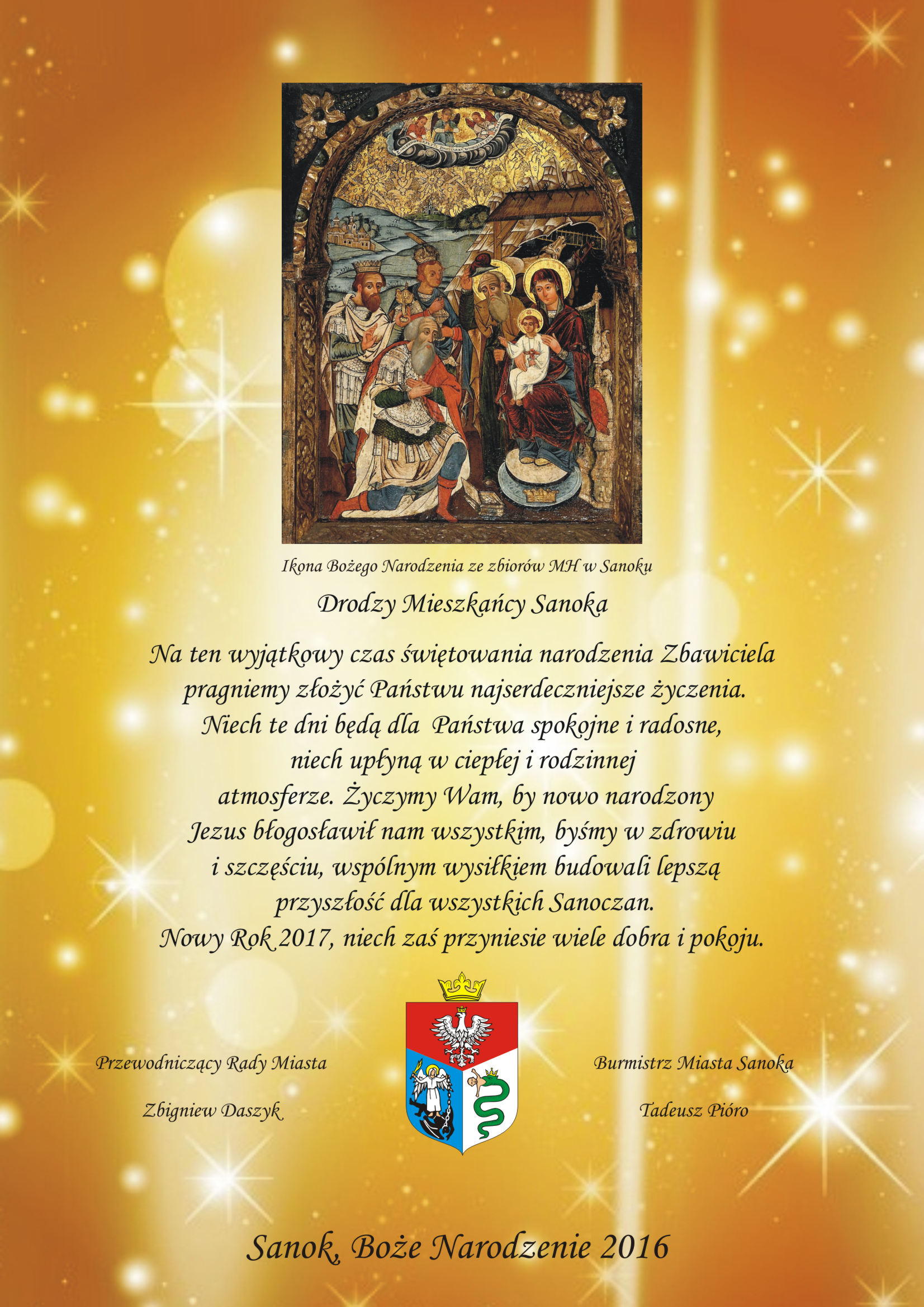 Życzenia świąteczne i noworoczne Dodano: 23-12-2016 Z okazji nadchodzących Świąt Bożego Narodzenia oraz Nowego Roku – 2017, najlepsze życzenia mieszkańcom miasta oraz przyjezdnym składają: Burmistrz Miasta Sanoka Tadeusz Pióro oraz Przewodniczący Rady Miasta Zbigniew Daszyk.
